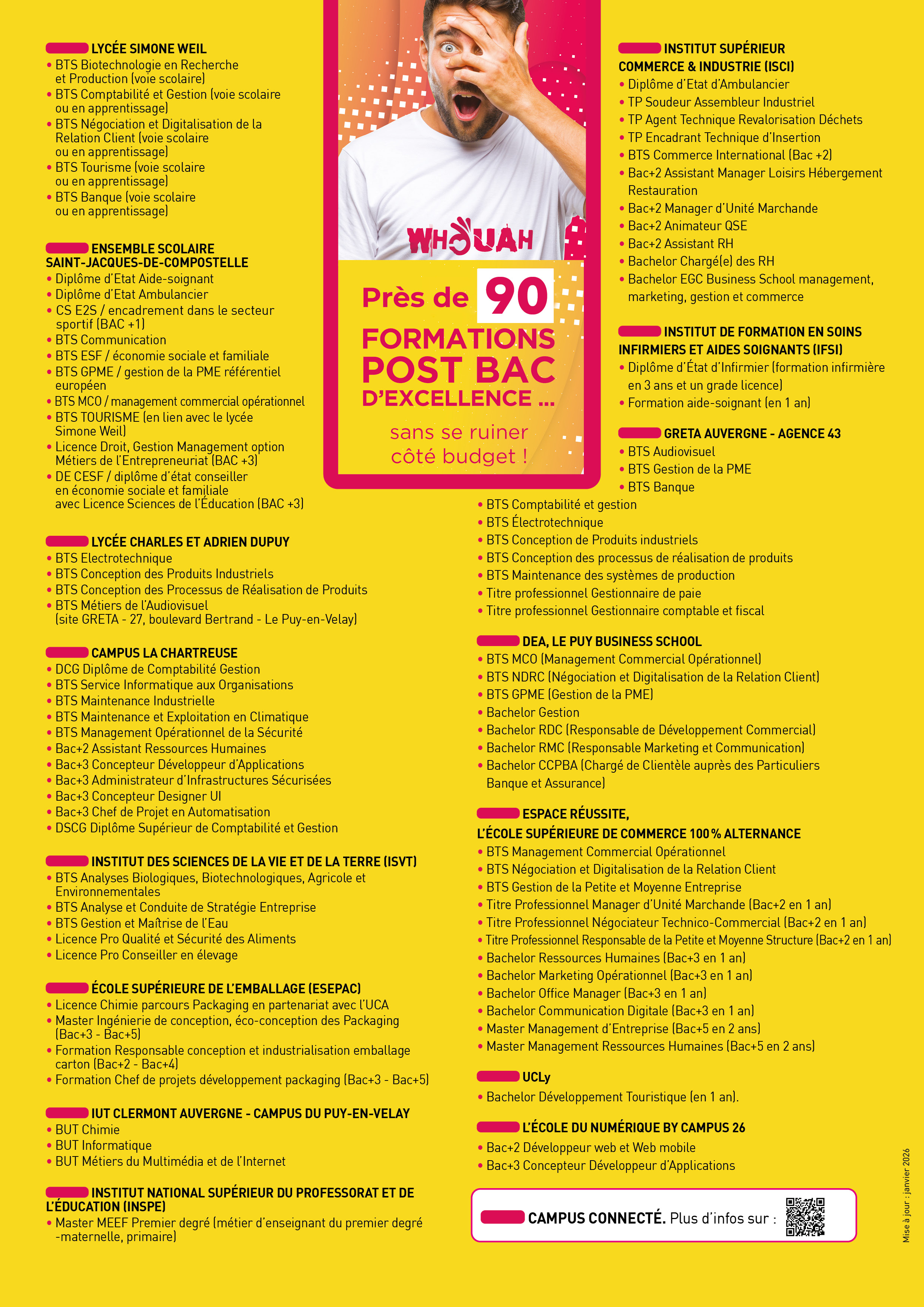 Formations post bac en lycées, mais aussi à IUT, l’UCLy, l’ESEPAC, à l’Institut de formation en Soins Infirmiers et des aides soignants, à l’INSPE, Espace réussite, DEA, l’ISCI, sans oublier le Campus Connecté, … avec près de 90 filières proposées, Le Puy-en-Velay affiche un panel de formations supérieures pluridisciplinaires et diversifiées qui répond aux aspirations d’un très grand nombre d’étudiants !