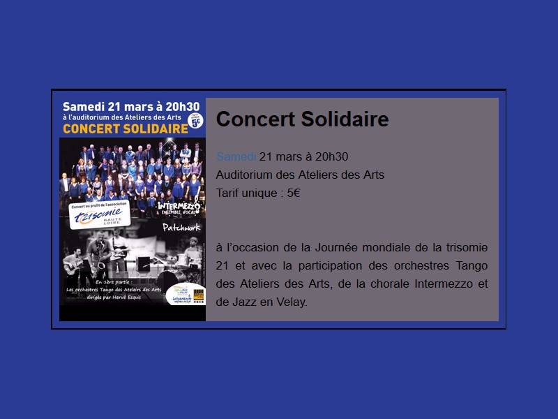 Concert à l’occasion de la journée mondiale de la trisomie 21 avec la participation des orchestres Tango des Ateliers des Arts, de la chorale Intermezzo et de Jazz en Velay.
