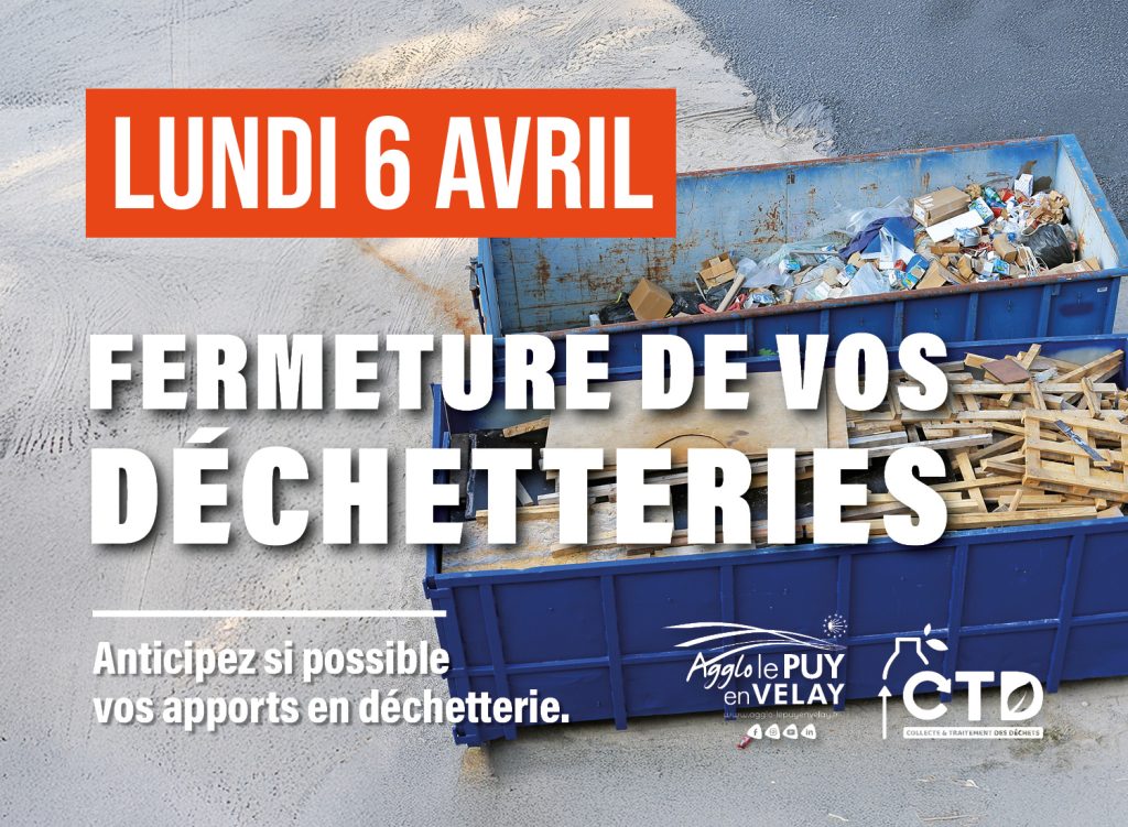 [JOUR FÉRIÉ ] ♻️ Les déchetteries de la Communauté d’agglomération du Puy-en-Velay seront fermées ce lundi 6 avril.
