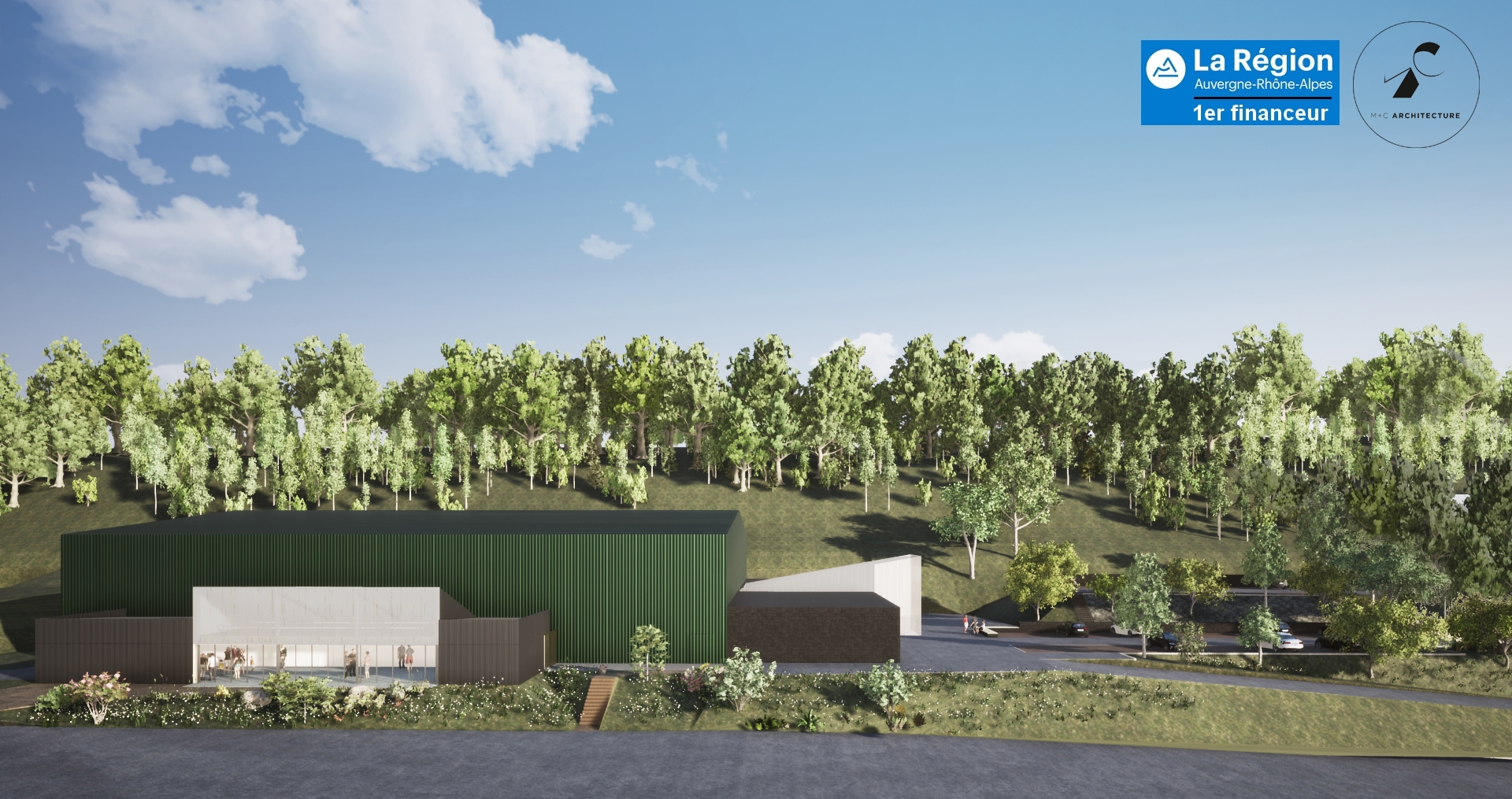 Le projet s’implante sur la partie Nord-Ouest de la parcelle, son architecture fonctionnaliste réalisée par M+C Architecture cherche à répondre de manière harmonieuse à l’existant. Un volume rectangulaire en ossature et bardage métalliques, dont l’altimétrie règne avec l’avancée habillée de pierres de l’entrée actuelle de la salle. Il s’insère en parallèle de la salle de sport actuelle le long de sa façade ouest à laquelle il vient s’accrocher via un dégagement clos mais non couvert.